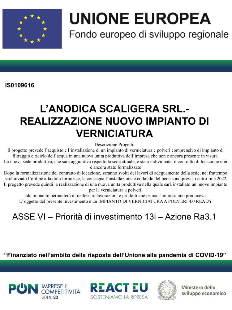 Il nuovo impianto è stato realizzato anche grazie alle agevolazioni messe a disposizione dal Ministero dello Sviluppo Economico che ha ritenuto ammissibile al contributo il nostro nuovo progetto per un importo di € 385 000,00.